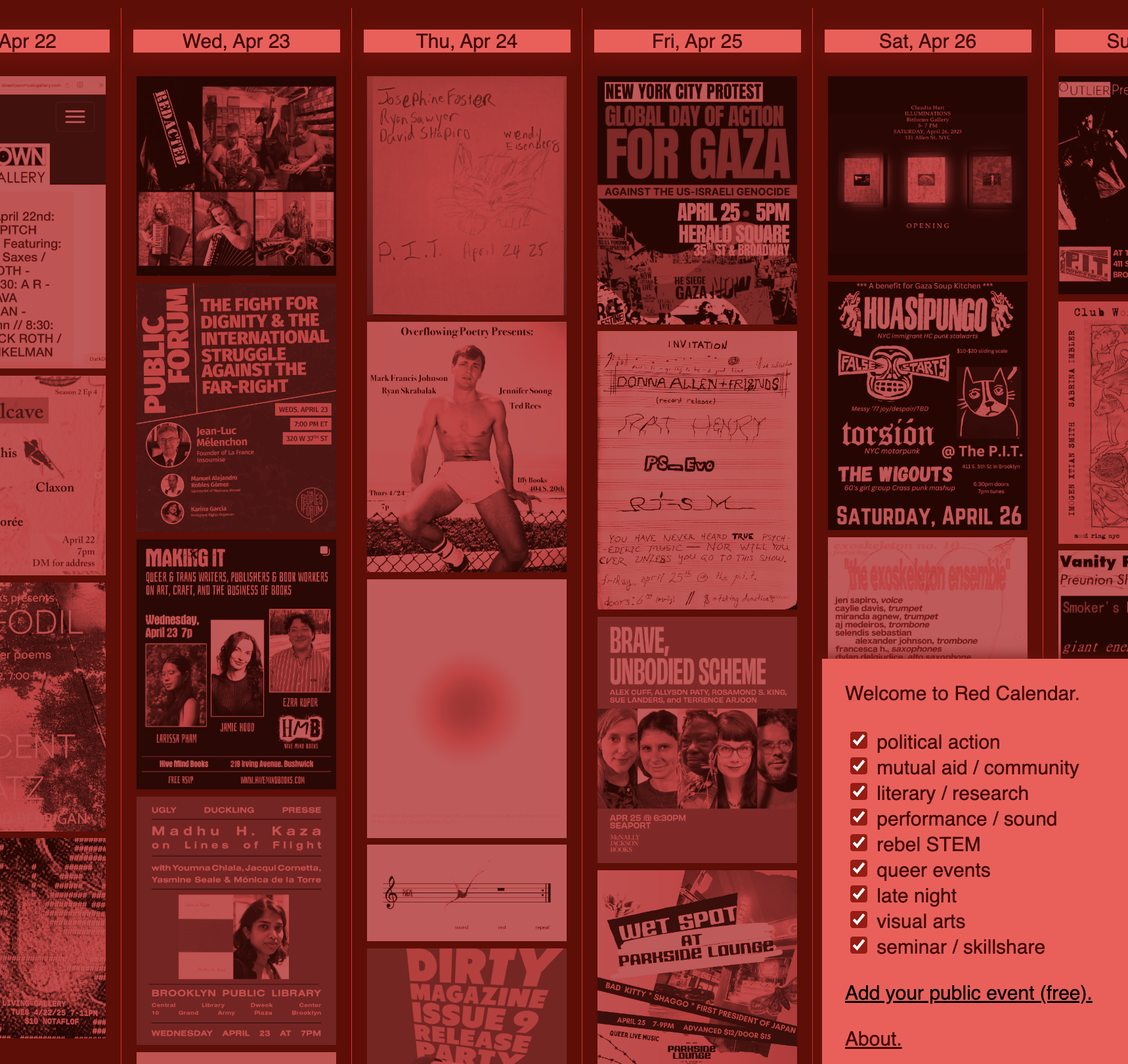 Pink Calendar is an arts and action calendar that helps NYC gather without big tech middlemen. Managed by a team of editors, the Calendar also encourages cross-pollination among NYC's leftist/arts/culture communities. Anyone can add events for free, pending editor approval!